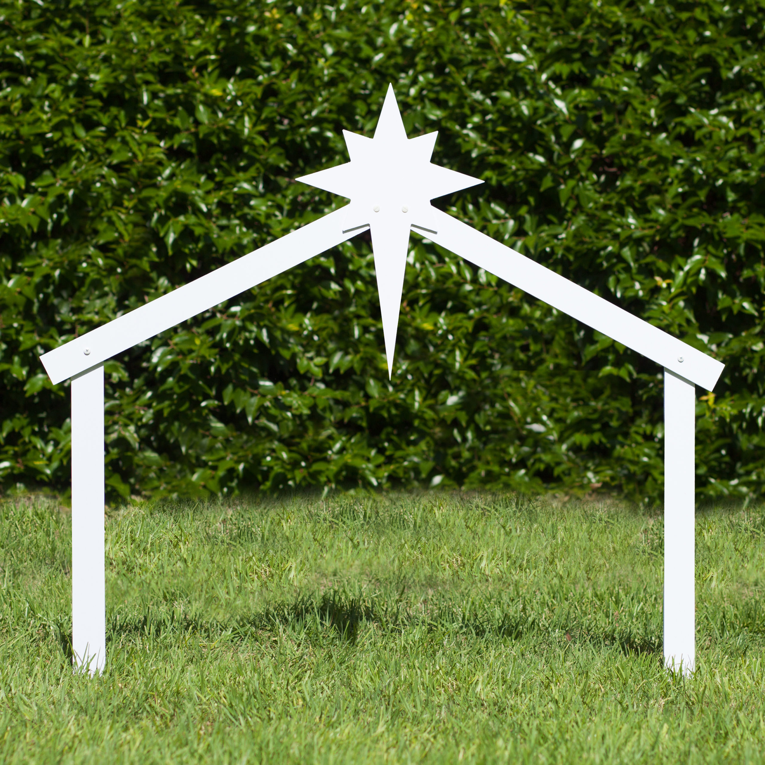 A product image of a White Outdoor Manger Stable For Sale at outdoornativitystore.com. Subscribe to our free newsletter Facebook Twitter Pinterest Email
